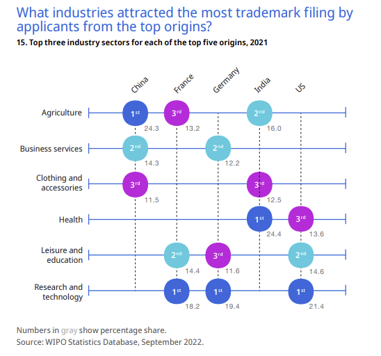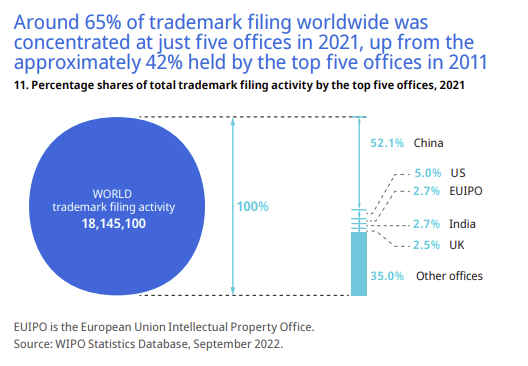 Nel 2021 i primi cinque trademark office (Cina, USA, EUIPO, India e Regno Unito) hanno rappresentato circa il 65% del deposito di marchi a livello mondiale di cui oltre la metà depositate presso l’ufficio cinese.