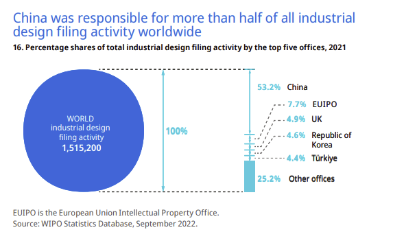 Nel 2021 sono state depositate circa 1,2 milioni di domande di design industriale (+9,2%) a livello mondiale. Quasi tre quarti (74,8%) dell’attività di deposito di design industriale a livello globale si è verificato in Cina (53,2%), EUIPO (7,7%) e Regno Unito (4,9%).