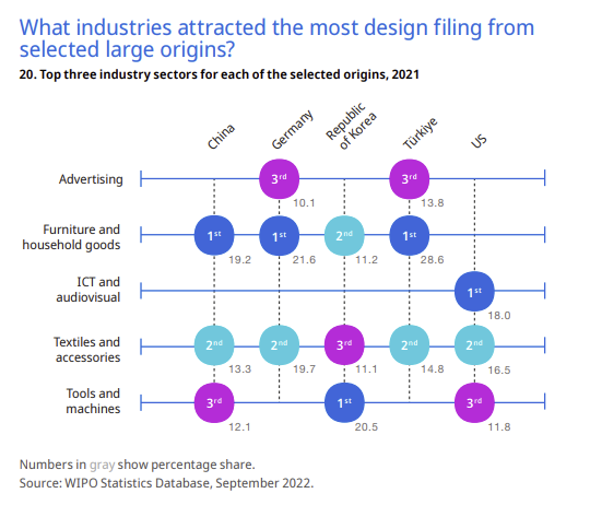 Tessile e accessori, mobile e casalinghi, e strumenti e macchine rappresentano i principali settori di deposito di design industriale.