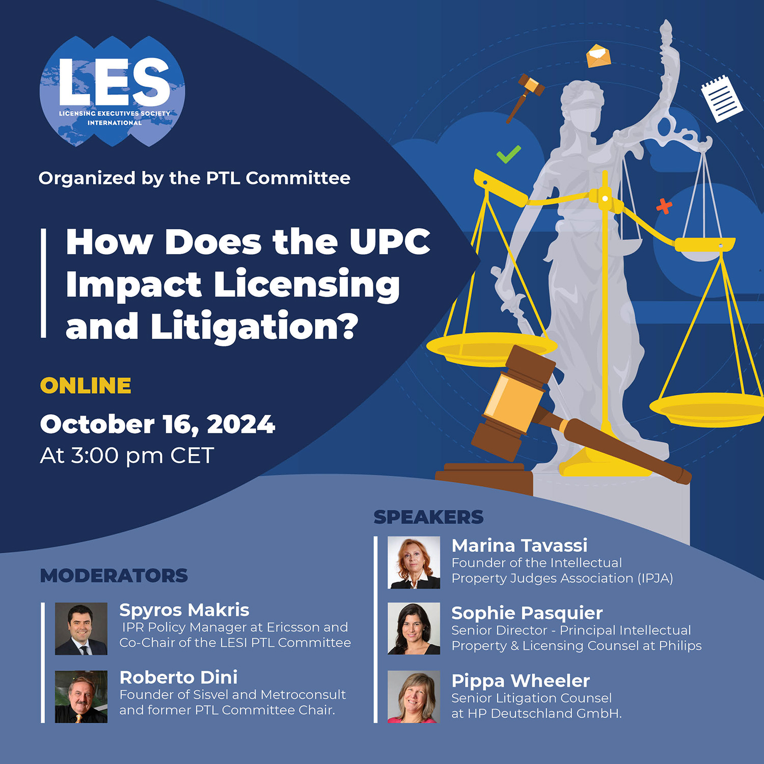 Online, 16 ottobre 2024 dalle h. 15 alle h. 16 Roberto Dini, Fondatore di Metroconsult e past chair del Patent & Technology Licensing Committee (PTL) di LES International, modererà, insieme a Spyros Makris, Responsabile della Politica IPR presso Ericsson e Co-Chair del PTL Committee, il webinar intitolato "How Does the UPC Impact Licensing and [...]