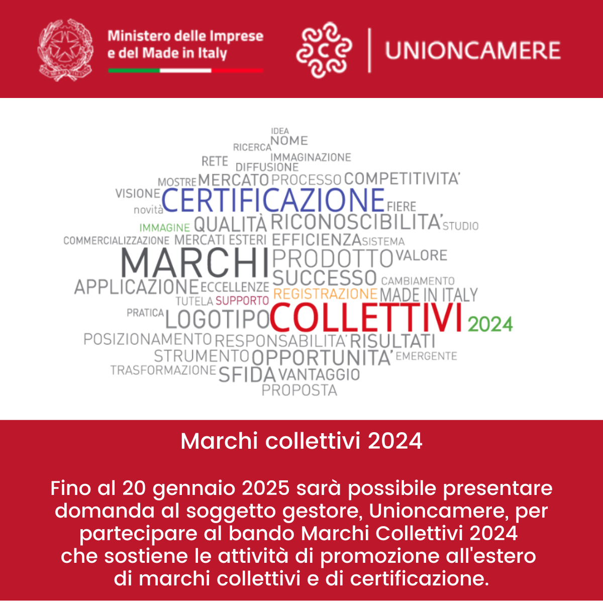Il Bando Marchi Collettivi 2024 sostiene le attività di promozione all'estero di marchi collettivi e di certificazione. A chi si rivolge La misura è promossa dal Ministero delle Imprese e del Made in Italy (MIMIT) e gestita da Unioncamere si rivolge a: associazioni rappresentative delle categorie produttive consorzi di tutela di cui all’art. 53 della legge [...]